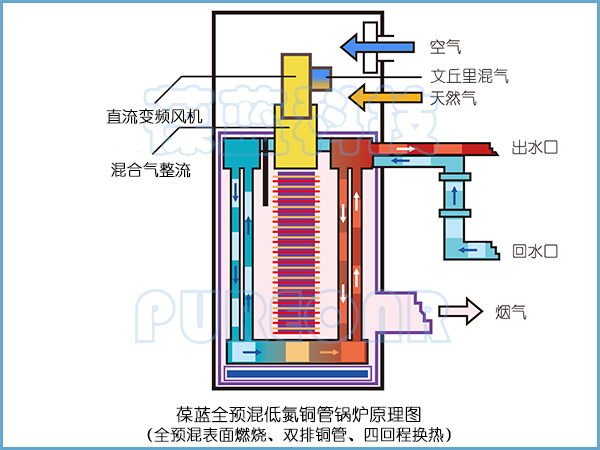 葆藍翅片銅管鍋爐四回程即使式換熱結(jié)構(gòu),燃燒室、次冷凝室、主冷凝室三室分離結(jié)構(gòu),壽命超長,導(dǎo)熱快,加熱精準。